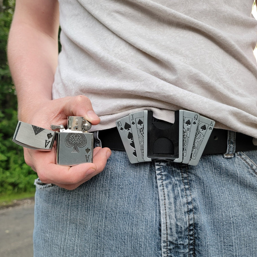 Check out this quality poker royal flush novelty belt buckle ZP holder that has its own Lighter style Ace of Spades lighter.